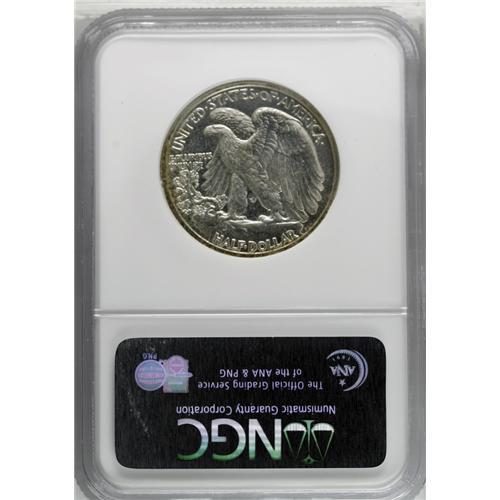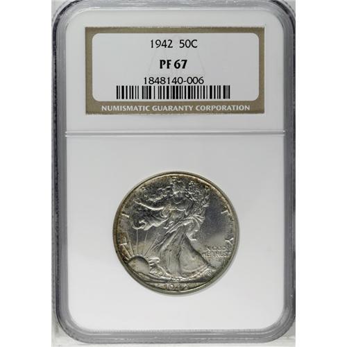 <B>1942<50C> PR67 NGC.</B></I> Luminous surfaces display hints of gold-tan and cobalt-blue color that gravitates to the border. The design elements are razor-sharp, and both sides are impeccably preserved.