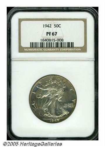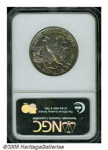 <B>1942<50C> PR67 NGC.</B></I> Splendid example that nears perfection, with milky orange, green and purple color over the bright surfaces