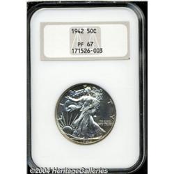 <B>1942<50C> PR67 NGC.</B></I> Essentially unmarked with light sienna patina that touches the rims and at places ventures out into the highly reflective fields. Highly attractive and certainly extremely desirable as a Superb Gem.<BR><I>From The Dr. Frank Lanza Collection of Walking Liberty Half Dollars.</B></I> <BR><BR><B>Important notice:</B> Heritage usually auctions material at the rate of 200-250 lots per hour. On some occasions eBay Live bid software or the Internet may not be able to keep up with the pace of the auction. We recommend placing a realistic absentee bid now as insurance to avoid disappointment. Occasionally the auctioneer may eliminate or reject an eBay Live bid, and the auctioneer may also reopen a lot after the close of the eBay live bidding (usually because we missed an audience bid), and may reject your bid even if it shows you as the winning bidder. By bidding via eBay Live, you agree that Heritage may award the lot to another bidder at its sole discretion under the circumstances described above or any other reasonable circumstances. Since eBay bids are not shown to us until we open the lot on the floor, we treat those bids just like floor bids. In most cases the floor responds before the eBay bid is presented to us, due to Internet lag time, so for consistency we have made it a policy that floor bids are always considered first over tie eBay live bids. Also please note that all Heritage lots purchased through eBay Live carry a 20% Buyer's Premium. Please make sure you read the Terms and Conditions before you bid. </span></font></tr></table></td></tr></table>