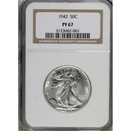 <B>1942 50C PR67 NGC.</B></I> Boldly impressed and gleaming with virtually brilliant surfaces. A remarkably appealing Superb Gem specimen from the last of the proof Walking Liberty half dollar issues.<BR><BR><B>Coin Engraver:</B> Adolph A. Weinman<BR><BR><b>Shipping:</b> Coins & Currency (<a target="_blank" href="http://www.heritageauctions.com/common/shipping.php">view shipping information</a>)
