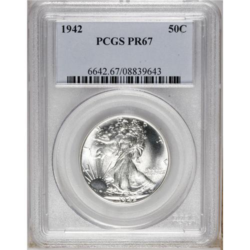 <B>1942<50C> PR67 PCGS.</B></I> A deeply reflective and shining Superb Gem that has dazzling brilliance. The devices are sharply defined, and the mirrors are unclouded.