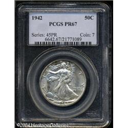 1942 50C PR67 PCGS. Fully struck with highly refle <B>1942 50C PR67 PCGS.</B></I> Fully struck with highly reflective fields and scattered, dappled patina on both obverse and reverse. A single tiny contact mark, near the center of the obverse, is the only minor surface flaw. <BR><BR><B>Important notice:</B> Heritage usually auctions material at the rate of 200-250 lots per hour. On some occasions eBay Live bid software or the Internet may not be able to keep up with the pace of the auction. We recommend placing a realistic absentee bid now as insurance to avoid disappointment. Occasionally the auctioneer may eliminate or reject an eBay Live bid, and the auctioneer may also reopen a lot after the close of the eBay live bidding (usually because we missed an audience bid), and may reject your bid even if it shows you as the winning bidder. By bidding via eBay Live, you agree that Heritage may award the lot to another bidder at its sole discretion under the circumstances described above or any other reasonable circumstances. Since eBay bids are not shown to us until we open the lot on the floor, we treat those bids just like floor bids. In most cases the floor responds before the eBay bid is presented to us, due to Internet lag time, so for consistency we have made it a policy that floor bids are always considered first over tie eBay live bids. Also please note that all Heritage lots purchased through eBay Live carry a 20% Buyer's Premium. Please make sure you read the Terms and Conditions before you bid. This lot is being auctioned in conjunction with a live floor auction by Heritage Galleries & Auctioneers. All final auction and invoice information will be supplied by Heritage Galleries & Auctioneers, and all other information should be considered preliminary. Lot:6309