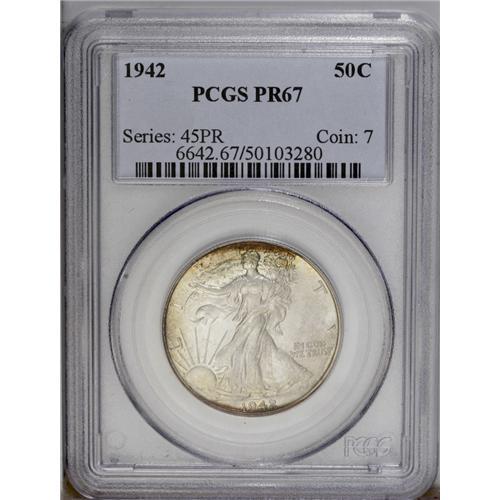 <B>1942<50C> PR67 PCGS.</B></I> Original pearl-gray, lime-gold, and russet-brown toning graces this pinpoint-sharp Superb Gem. Untold numbers of certified proof Walkers have been dipped at one time or another, but the present specimen is an exception. <BR><BR><B>Important notice:</B> Heritage usually auctions material at the rate of 200-250 lots per hour. On some occasions eBay Live bid software or the Internet may not be able to keep up with the pace of the auction. We recommend placing a realistic absentee bid now as insurance to avoid disappointment. Occasionally the auctioneer may eliminate or reject an eBay Live bid, and the auctioneer may also reopen a lot after the close of the eBay live bidding (usually because we missed an audience bid), and may reject your bid even if it shows you as the winning bidder. By bidding via eBay Live, you agree that Heritage may award the lot to another bidder at its sole discretion under the circumstances described above or any other reasonable circumstances. Since eBay bids are not shown to us until we open the lot on the floor, we treat those bids just like floor bids. In most cases the floor responds before the eBay bid is presented to us, due to Internet lag time, so for consistency we have made it a policy that floor bids are always considered first over tie eBay live bids. Also please note that all Heritage lots purchased through eBay Live carry a 20% Buyer's Premium. Please make sure you read the Terms and Conditions before you bid. This lot is being auctioned in conjunction with a live floor auction by Heritage Galleries & Auctioneers. All final auction and invoice information will be supplied by Heritage Galleries & Auctioneers, and all other information should be considered preliminary. Lot:3069 <BR><BR><B>Winning Notification and Billing:</B> After the FINAL session in this auction is complete, Heritage will send e-mail and snail mail invoices. This process normally takes several days. All final auction and invoice information will be supplied by Heritage Galleries & Auctioneers, and all other information should be considered preliminary. <BR><BR>This auction will be conducted on a live auction floor and over the Internet through eBay Live. If you choose to place an absentee bid, please take a moment to <font color='#0000ff'><u><a href='http://pages.ebay.com/liveauctions/help/before/laabsentee.html'>learn how eBay Live absentee bidding works</a></u></font><font color='#000000'>