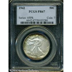 1942 50C PR67 PCGS. Russet and apricot colors fram <B>1942 50C PR67 PCGS.</B></I> Russet and apricot colors frame the cream-gray centers of this exquisitely struck and nicely mirrored Superb Gem. A good choice for the assembler of a high grade 20th century type set. <BR><BR><B>Important notice:</B> Heritage usually auctions material at the rate of 200-250 lots per hour. On some occasions eBay Live bid software or the Internet may not be able to keep up with the pace of the auction. We recommend placing a realistic absentee bid now as insurance to avoid disappointment. Occasionally the auctioneer may eliminate or reject an eBay Live bid, and the auctioneer may also reopen a lot after the close of the eBay live bidding (usually because we missed an audience bid), and may reject your bid even if it shows you as the winning bidder. By bidding via eBay Live, you agree that Heritage may award the lot to another bidder at its sole discretion under the circumstances described above or any other reasonable circumstances. Since eBay bids are not shown to us until we open the lot on the floor, we treat those bids just like floor bids. In most cases the floor responds before the eBay bid is presented to us, due to Internet lag time, so for consistency we have made it a policy that floor bids are always considered first over tie eBay live bids. Also please note that all Heritage lots purchased through eBay Live carry a 20% Buyer's Premium. Please make sure you read the Terms and Conditions before you bid. This lot is being auctioned in conjunction with a live floor auction by Heritage Galleries & Auctioneers. All final auction and invoice information will be supplied by Heritage Galleries & Auctioneers, and all other information should be considered preliminary. Lot:6308