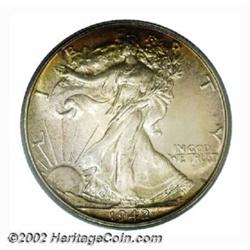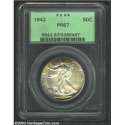 1942 50C PR67 PCGS. The upper and lower obverse borders, as well as the left periphery on the reverse, are overlaid in vivid reddish-olive iridescence. The balance of the originally preserved surfaces exhibit mostly even medium gray patina. A fully impressed Superb Gem for the toning enthusiast. Important notice: We expect to be auctioning lots at the rate of 200-250 per hour. Sometimes eBay Premier live bid software cannot keep up with that pace, so we strongly recommend that you place a realistic proxy bid now as insurance to avoid disappointment. Also please note that all Heritage/CAA lots purchased through eBay Premier carry a 20% Buyer's Premium. Please make sure you read the Terms and Conditions.