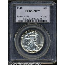 <B>1942<50C> PR67 PCGS.</B></I> Seeming perfectly made and entirely pristine, this Superb Gem proof has flashy, highly-reflective fields, with just a touch of golden patina at selected border areas. <BR><BR><B>Important notice:</B> Heritage usually auctions material at the rate of 200-250 lots per hour. On some occasions eBay Live bid software or the Internet may not be able to keep up with the pace of the auction. We recommend placing a realistic absentee bid now as insurance to avoid disappointment. Occasionally the auctioneer may eliminate or reject an eBay Live bid, and the auctioneer may also reopen a lot after the close of the eBay live bidding (usually because we missed an audience bid), and may reject your bid even if it shows you as the winning bidder. By bidding via eBay Live, you agree that Heritage may award the lot to another bidder at its sole discretion under the circumstances described above or any other reasonable circumstances. Since eBay bids are not shown to us until we open the lot on the floor, we treat those bids just like floor bids. In most cases the floor responds before the eBay bid is presented to us, due to Internet lag time, so for consistency we have made it a policy that floor bids are always considered first over tie eBay live bids. Also please note that all Heritage lots purchased through eBay Live carry a 20% Buyer's Premium. Please make sure you read the Terms and Conditions before you bid. </span></font></tr></table></td></tr></table>
