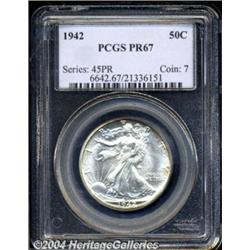 <B>1942<50C> PR67 PCGS.</B></I> A popular issue amongst collectors, this proof Walker is highly reflective in the fields with miniscule amounts of undistracting color around the peripheries. In every sense of the word, a Superb Gem. <BR><BR><B>Important notice:</B> Heritage usually auctions material at the rate of 200-250 lots per hour. On some occasions eBay Live bid software or the Internet may not be able to keep up with the pace of the auction. We recommend placing a realistic absentee bid now as insurance to avoid disappointment. Occasionally the auctioneer may eliminate or reject an eBay Live bid, and the auctioneer may also reopen a lot after the close of the eBay live bidding (usually because we missed an audience bid), and may reject your bid even if it shows you as the winning bidder. By bidding via eBay Live, you agree that Heritage may award the lot to another bidder at its sole discretion under the circumstances described above or any other reasonable circumstances. Since eBay bids are not shown to us until we open the lot on the floor, we treat those bids just like floor bids. In most cases the floor responds before the eBay bid is presented to us, due to Internet lag time, so for consistency we have made it a policy that floor bids are always considered first over tie eBay live bids. Also please note that all Heritage lots purchased through eBay Live carry a 20% Buyer's Premium. Please make sure you read the Terms and Conditions before you bid. </span></font></tr></table></td></tr></table>
