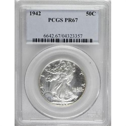 <B>1942 50C PR67 PCGS.</B></I> This appealing Superb Gem proof is essentially untoned with stellar luster and lovely silver-blue surfaces. A decisively struck example from the final proof Walking Liberty half dollar issue.<BR><BR><b>Shipping:</b> Coins & Currency (<a target="_blank" href="http://www.heritageauctions.com/common/shipping.php">view shipping information</a>)