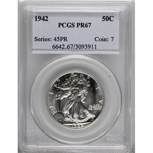 <B>1942 50C PR67 PCGS.</B></I> Brilliant surfaces exhibit impressively struck design features, and close examination reveals both faces to be devoid of significant marks. All in all, a splendid Superb Gem proof. Bruce Fox, in his <I>Complete Guide to Walking Liberty Half Dollars,</B></I> writes of the 1942 half dollar: "I believe all nice proof issues are presently undervalued."<BR><BR><b>Shipping:</b> Coins & Currency (<a target="_blank" href="http://www.heritageauctions.com/common/shipping.php">view shipping information</a>)