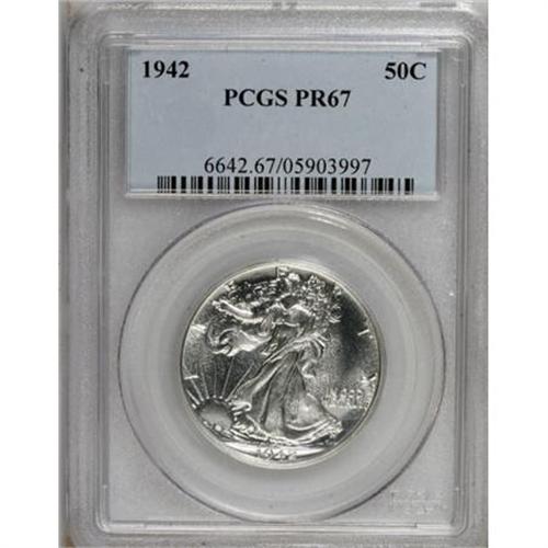 <B>1942 50C PR67 PCGS.</B></I> This fully brilliant Superb Gem is essentially immaculate. The devices display noticeable frost, although the contrast is insufficient for a rare Cameo designation.<BR><BR><B>Coin Engraver:</B> Adolph A. Weinman<BR><BR><b>Shipping:</b> Coins & Currency (<a target="_blank" href="http://www.heritageauctions.com/common/shipping.php">view shipping information</a>)