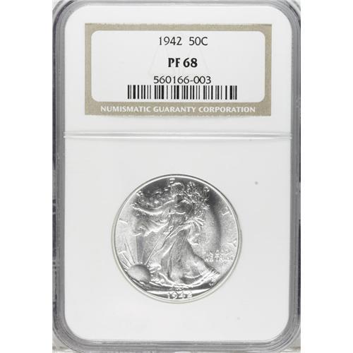 <B>1942 50C PR68 NGC.</B></I> Brilliant throughout, The fields are deeply mirrored and the pristine, unmarked surfaces add even more to the overall appeal of this widely collected 20th century type coin. Several high grade proofs are included in this sale, and this coin gives the collector the option of acquiring an untoned example. Census: 136 in 68, 4 finer (4/07).<BR><BR><b>Shipping:</b> Coins & Currency (<a target="_blank" href="http://www.heritageauctions.com/common/shipping.php">view shipping information</a>)