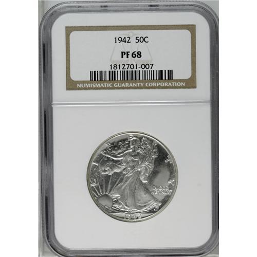 <B>1942<50C> PR68 NGC.</B></I> Brilliant throughout and hairline-free, the surfaces are essentially perfect. Additionally, the devices show just the slightest bit of mint frost which gives the coin a modest cameo effect, not enough to warrant a Cameo designation perhaps, but enough to add to this coin's eye appeal and desirability. Census: 126 in 68, 4 finer (3/06).