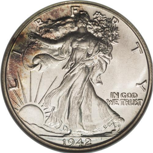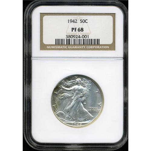 <B>1942 50C PR68 NGC.</B></I> Nicely mirrored with the slightest haze of silver patina over nearly immaculate surfaces. A touch of green and russet toning along the left side of the obverse is accompanied by a few scattered splashes of similar color on the reverse. PR68 and finer representatives of this issue comprise fewer than one percent of the original mintage.<BR><BR><b>Shipping:</b> Coin/Currency (<a target="_blank" href="http://www.heritageauctions.com/common/shipping.php">view shipping information</a>)