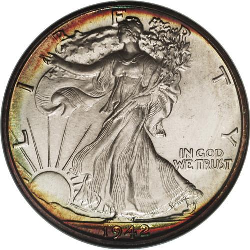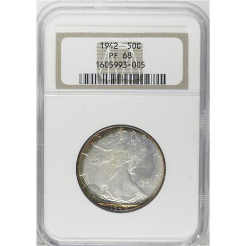 <B>1942 50C PR68 NGC.</B></I> The obverse of this wondrously preserved proof Walker is lightly patinated inside of a lengthy crescent of orange and crimson iridescent toning. Similar, but less dramatic shades of color disperse to near-brilliance at the center of the reverse where the full effect of the mirrored surfaces shines forcefully through.<BR><BR><b>Shipping:</b> Coin/Currency (<a target="_blank" href="http://www.heritageauctions.com/common/shipping.php">view shipping information</a>)