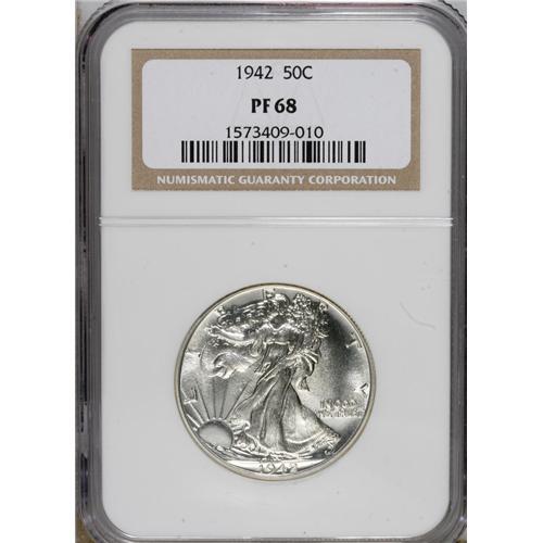 <B>1942 50C PR68 NGC.</B></I> This was the final year of Walking Liberty half dollar proof production, with a coinage of 21,120 pieces. As to be expected, these coins are relatively plentiful, especially through the PR67 grade level. We present hear a specimen in PR68 that displays brilliant, virtually pristine surfaces. The design elements reveal exquisite definition throughout.<BR><BR><b>Shipping:</b> Coins & Currency (<a target="_blank" href="http://www.heritageauctions.com/common/shipping.php">view shipping information</a>)