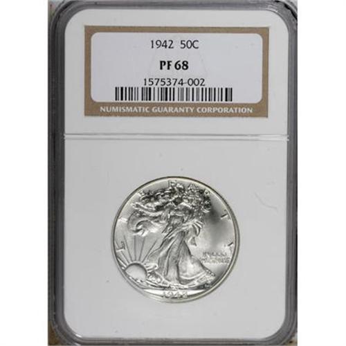 <B>1942 50C PR68 NGC.</B></I> Brilliant on each side. The surfaces are virtually unblemished, as one would expect from the grade. The fields also show illimitable depth of reflectivity. While NGC lists four pieces in PR69, it is hard to imagine how a coin could have more visual appeal than this amazing proof.<BR><BR><b>Shipping:</b> Coins & Currency (<a target="_blank" href="http://www.heritageauctions.com/common/shipping.php">view shipping information</a>)