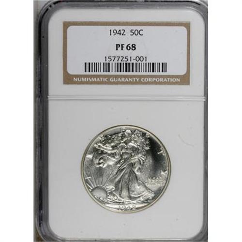 <B>1942 50C PR68 NGC.</B></I> Crisp definition is seen on the design elements of this brilliant proof, and both faces reveal impeccable preservation. This represents the last year of proof production in the Walking Liberty Half dollar series, and also exhibits the highest mintage (21,120 pieces). <BR><BR><B>Coin Engraver:</B> Adolph A. Weinman<BR><BR><b>Shipping:</b> Coins & Currency (<a target="_blank" href="http://www.heritageauctions.com/common/shipping.php">view shipping information</a>)