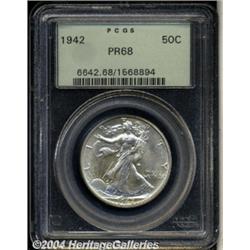 <B>1942<50C> PR68 PCGS.</B></I> A gorgeous proof coin with solid details and flashy, slightly hazy fields. This Superb Gem shows no apparent marks, and exhibits slight contrast between the fields and devices, somewhat unusual for the type. <BR><BR><B>Important notice:</B> Heritage usually auctions material at the rate of 200-250 lots per hour. On some occasions eBay Live bid software or the Internet may not be able to keep up with the pace of the auction. We recommend placing a realistic absentee bid now as insurance to avoid disappointment. Occasionally the auctioneer may eliminate or reject an eBay Live bid, and the auctioneer may also reopen a lot after the close of the eBay live bidding (usually because we missed an audience bid), and may reject your bid even if it shows you as the winning bidder. By bidding via eBay Live, you agree that Heritage may award the lot to another bidder at its sole discretion under the circumstances described above or any other reasonable circumstances. Since eBay bids are not shown to us until we open the lot on the floor, we treat those bids just like floor bids. In most cases the floor responds before the eBay bid is presented to us, due to Internet lag time, so for consistency we have made it a policy that floor bids are always considered first over tie eBay live bids. Also please note that all Heritage lots purchased through eBay Live carry a 20% Buyer's Premium. Please make sure you read the Terms and Conditions before you bid. </span></font></tr></table></td></tr></table>