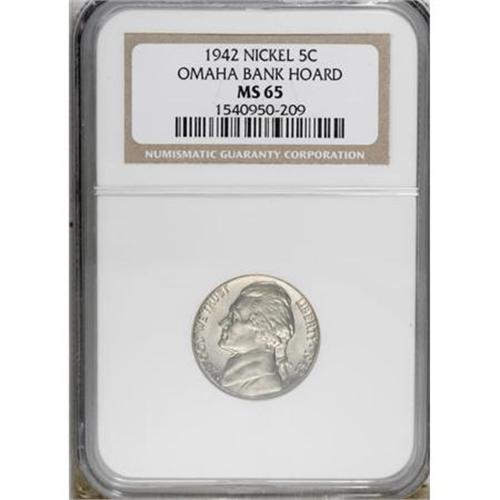 <B>1942 5C Type One MS65 NGC.</B></I> Ex: Omaha Bank Hoard. NGC Census: (47/200). PCGS Population (106/215). Mintage: 49,818,600. Numismedia Wsl. Price for NGC/PCGS coin in MS65: $24. (#4013)<BR><BR><B>Coin Engraver:</B> Felix Schlag<BR><BR><b>Shipping:</b> Coins & Currency (<a target="_blank" href="http://www.heritageauctions.com/common/shipping.php">view shipping information</a>)