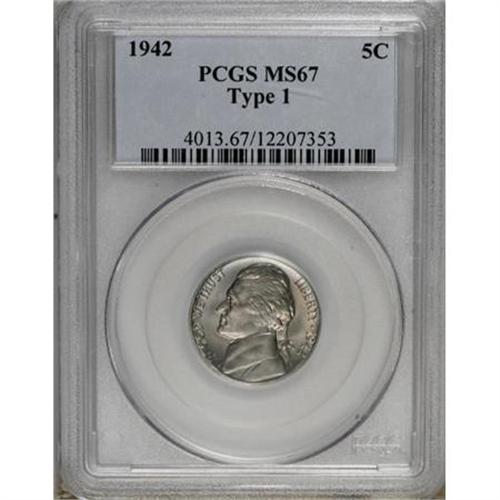 <B>1942 5C Type One MS67 PCGS.</B></I> . PCGS Population (5/0). NGC Census: (99/0). Mintage: 49,818,600. Numismedia Wsl. Price for NGC/PCGS coin in MS67: $105. (#4013)<BR><BR><B>Coin Engraver:</B> Felix Schlag<BR><BR><b>Shipping:</b> Coins & Currency (<a target="_blank" href="http://www.heritageauctions.com/common/shipping.php">view shipping information</a>)