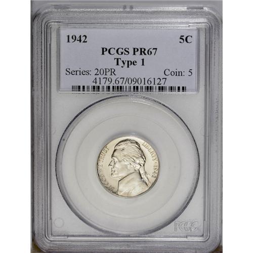 <B>1942<5C> Type One PR67 PCGS.</B></I> Silvery-blue surfaces with a tinge of gold at the rims. Boldly struck, with no visible impediments.<BR><I>From The David L. Goodwin Collection.</B></I> <BR><BR><B>Important notice:</B> Heritage usually auctions material at the rate of 200-250 lots per hour. On some occasions eBay Live bid software or the Internet may not be able to keep up with the pace of the auction. We recommend placing a realistic absentee bid now as insurance to avoid disappointment. Occasionally the auctioneer may eliminate or reject an eBay Live bid, and the auctioneer may also reopen a lot after the close of the eBay live bidding (usually because we missed an audience bid), and may reject your bid even if it shows you as the winning bidder. By bidding via eBay Live, you agree that Heritage may award the lot to another bidder at its sole discretion under the circumstances described above or any other reasonable circumstances. Since eBay bids are not shown to us until we open the lot on the floor, we treat those bids just like floor bids. In most cases the floor responds before the eBay bid is presented to us, due to Internet lag time, so for consistency we have made it a policy that floor bids are always considered first over tie eBay live bids. Also please note that all Heritage lots purchased through eBay Live carry a 20% Buyer's Premium. Please make sure you read the Terms and Conditions before you bid. This lot is being auctioned in conjunction with a live floor auction by Heritage Galleries & Auctioneers. All final auction and invoice information will be supplied by Heritage Galleries & Auctioneers, and all other information should be considered preliminary. Lot:1176 <BR><BR><B>Winning Notification and Billing:</B> After the FINAL session in this auction is complete, Heritage will send e-mail and snail mail invoices. This process normally takes several days. All final auction and invoice information will be supplied by Heritage Galleries & Auctioneers, and all other information should be considered preliminary. <BR><BR>This auction will be conducted on a live auction floor and over the Internet through eBay Live. If you choose to place an absentee bid, please take a moment to <font color='#0000ff'><u><a href='http://pages.ebay.com/liveauctions/help/before/laabsentee.html'>learn how eBay Live absentee bidding works</a></u></font><font color='#000000'>