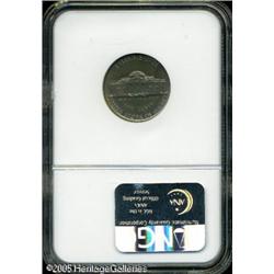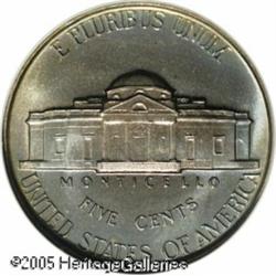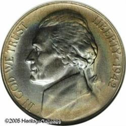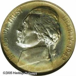 <B>1942 5C Type One PR68 NGC.</B></I> A melange of pale-blue, gold, violet, and crimson colors dominates both sides of this highly attractive Jefferson nickel. A couple of minor, insignificant ticks are noted on Jefferson's cheek and collar. Population: 9 in 68, 0 finer (1/05). Lot:6091