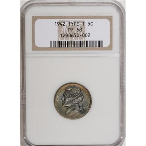 <B>1942 5C Type One PR68 NGC.</B></I> A decisively struck and beautifully toned example of what would be the last copper-nickel five cent proof until 1950. Outer bands of peach and yellow cede to watery blue-green in the centers. Magnificently preserved and among the best examples of the issue available today. Census: 9 in 68, 0 finer (11/07).<BR><BR><B>Coin Engraver:</B> Felix Schlag<BR><BR><b>Shipping:</b> Coins & Currency (<a target="_blank" href="http://www.heritageauctions.com/common/shipping.php">view shipping information</a>)