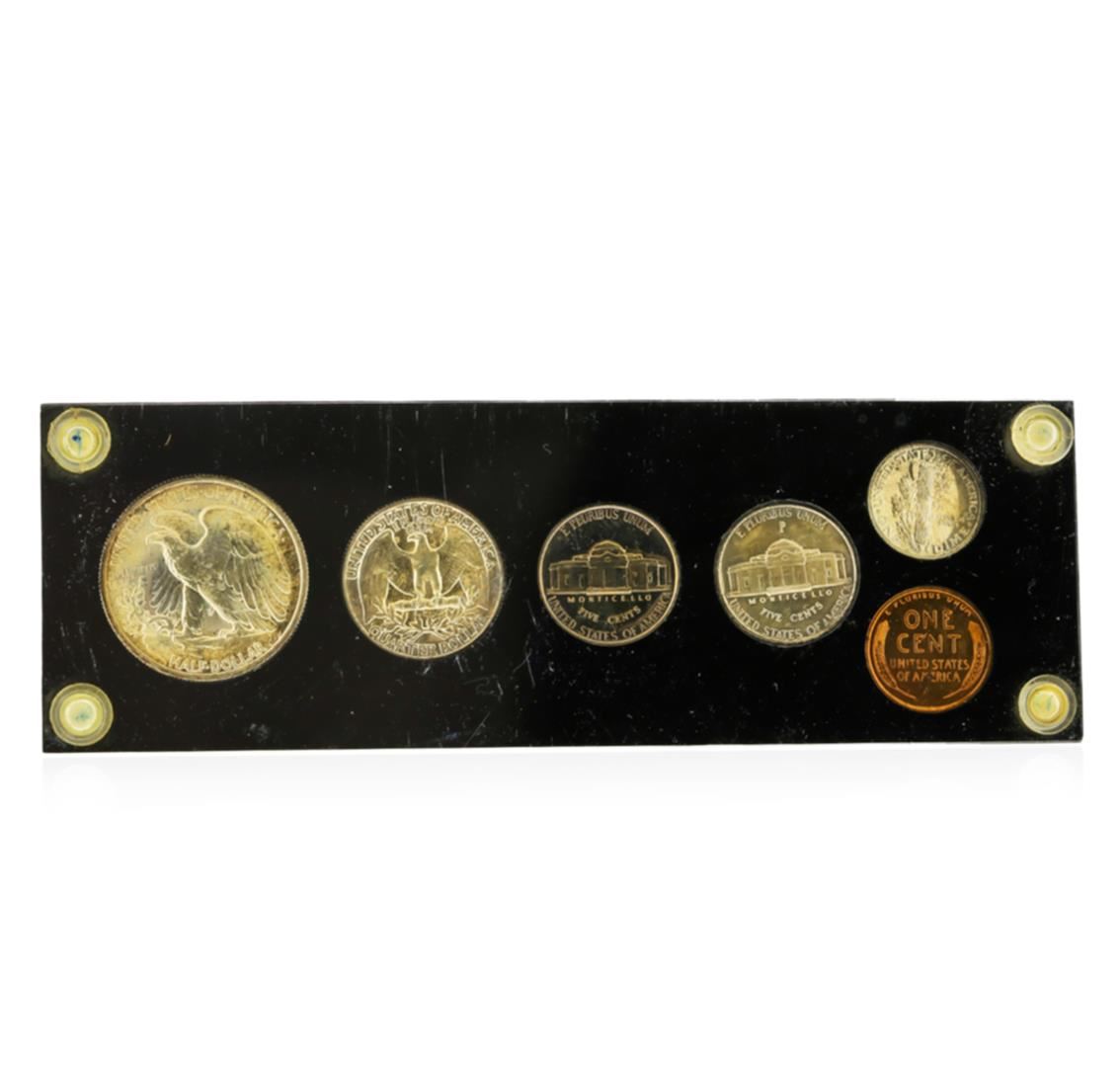 This 1942 (6) Coin Proof Set includes the following coins: 1942 Walking Liberty Half Dollar, 1942 Washington Quarter, 1942 Mercury Dime, 1942 Jefferson Nickel, 1942-P Jefferson Nickel, and a 1942 Lincoln Wheat Cent.