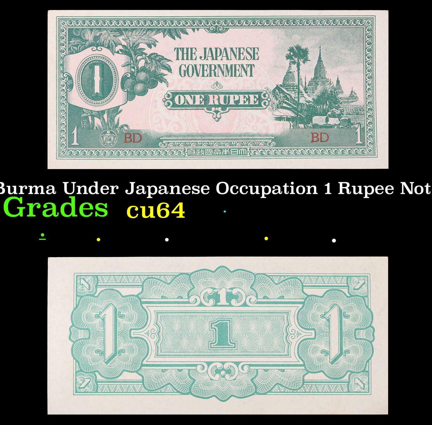 1942 Burma Under Japanese Occupation 1 Rupee Note P: 14A Grades Choice CU. Japanese invasion money, officially known as Southern Development Bank Notes (Japanese: ??????? Dai T?-A Sens? gunpy?, "Greater East Asia War military scrip"), was currency issued by the Japanese Military Authority as a replacement for local currency after the conquest of colonies and other states in World War II. Japan printed this currency for many countries, including Malaysia, Singapore, North Borneo, Sarawak, Burma, Brunei, and several Oceania territories controlled by Australia.