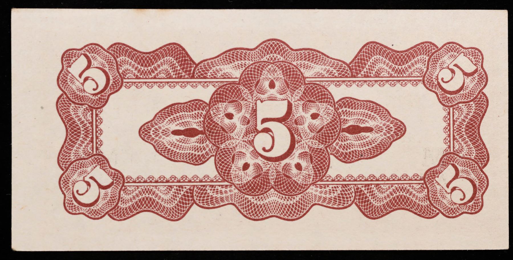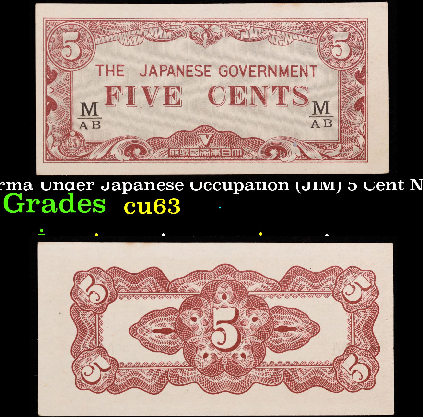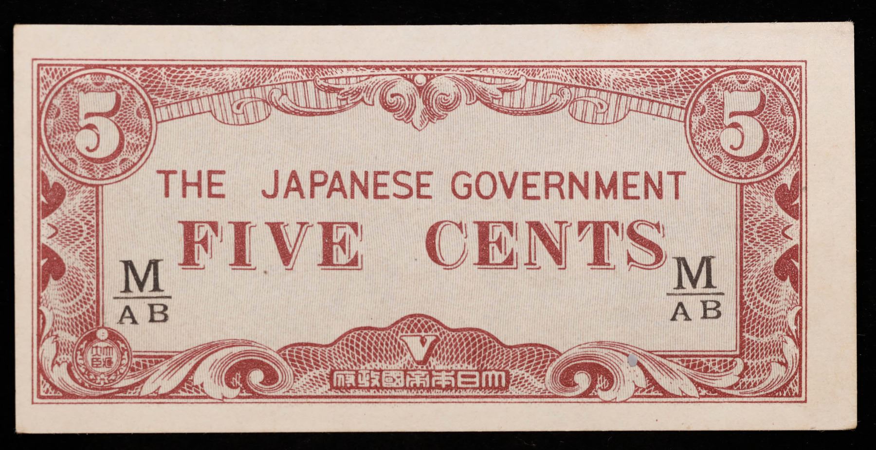 1942 Burma Under Japanese Occupation (JIM) 5 Cent Note P# 10B Grades Select CU. Japanese invasion money, officially known as Southern Development Bank Notes (Japanese: ??????? Dai T?-A Sens? gunpy?, "Greater East Asia War military scrip"), was currency issued by the Japanese Military Authority as a replacement for local currency after the conquest of colonies and other states in World War II. Japan printed this currency for many countries, including Malaysia, Singapore, North Borneo, Sarawak, Burma, Brunei, and several Oceania territories controlled by Australia.