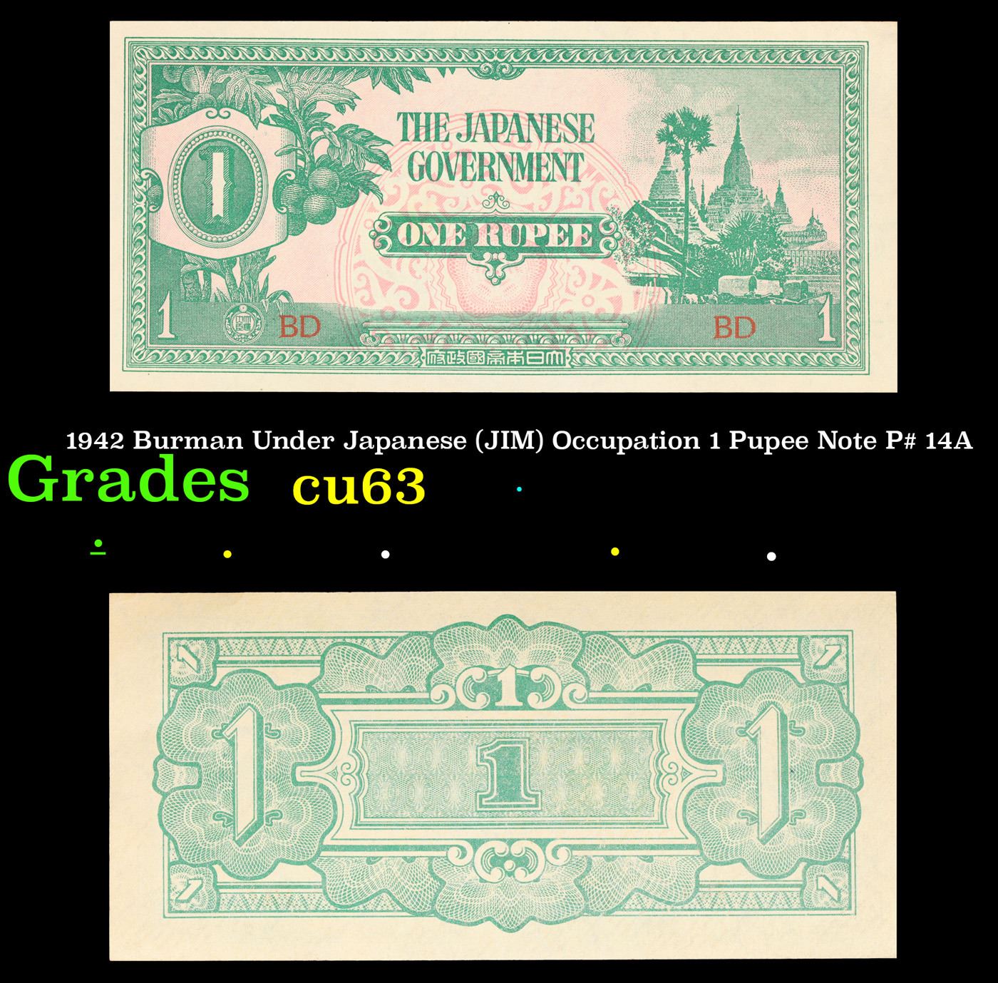 1942 Burman Under Japanese (JIM) Occupation 1 Pupee Note P# 14A Grades Select CU. Japanese invasion money, officially known as Southern Development Bank Notes (Japanese: ??????? Dai T?-A Sens? gunpy?, "Greater East Asia War military scrip"), was currency issued by the Japanese Military Authority as a replacement for local currency after the conquest of colonies and other states in World War II. Japan printed this currency for many countries, including Malaysia, Singapore, North Borneo, Sarawak, Burma, Brunei, and several Oceania territories controlled by Australia.