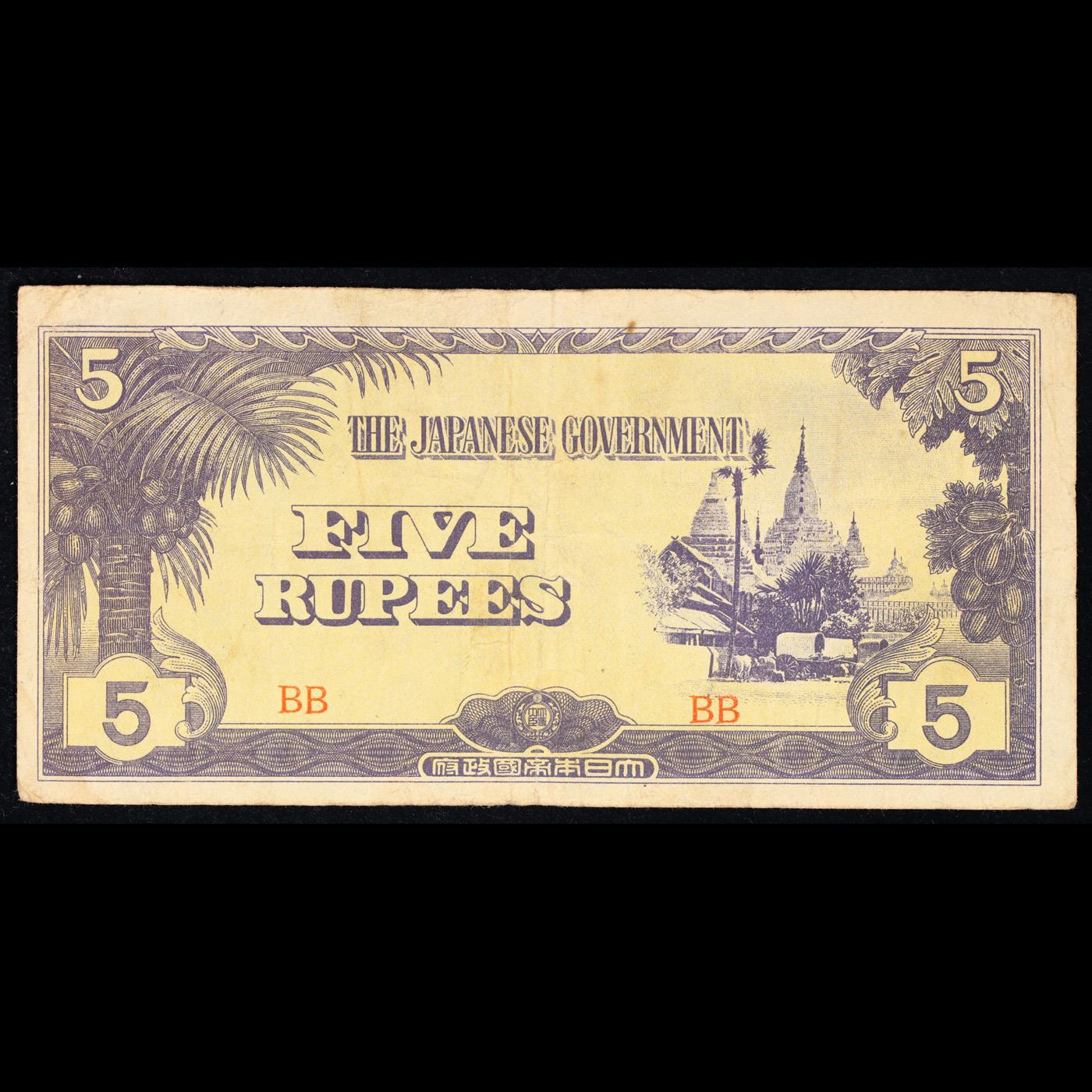 1942 Burman Under Japanese (JIM) Occupation 5 Pupee Note P# 15B Grades vf++. Japanese invasion money, officially known as Southern Development Bank Notes (Japanese: ??????? Dai T?-A Sens? gunpy?, "Greater East Asia War military scrip"), was currency issued by the Japanese Military Authority as a replacement for local currency after the conquest of colonies and other states in World War II. Japan printed this currency for many countries, including Malaysia, Singapore, North Borneo, Sarawak, Burma, Brunei, and several Oceania territories controlled by Australia.