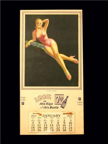 1942 Calendar for 7-UP, entitled Pink Lady, full pad. Staining around staples otherwise mint condition. 6 X 11 1/2 inches.