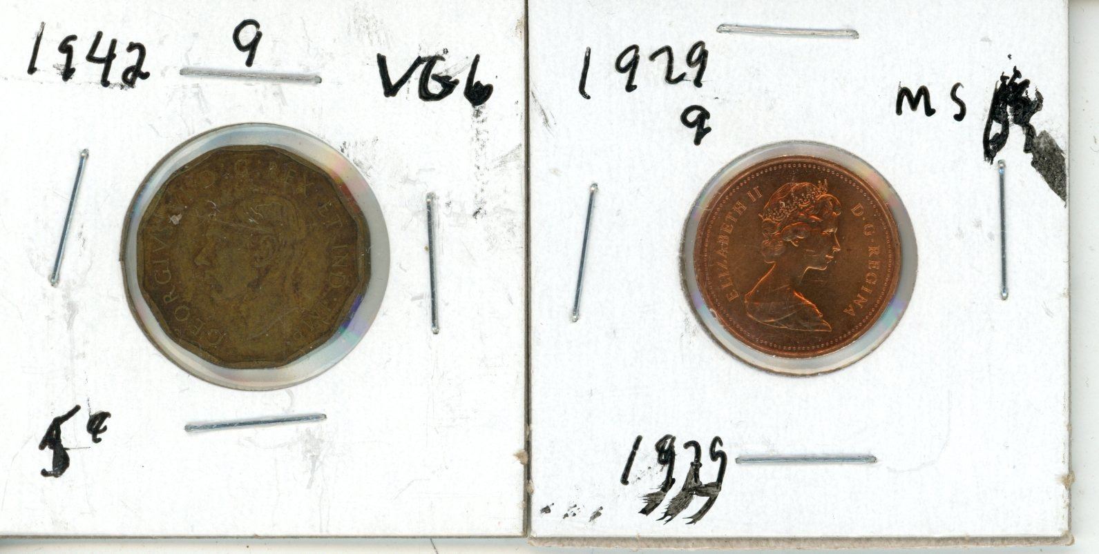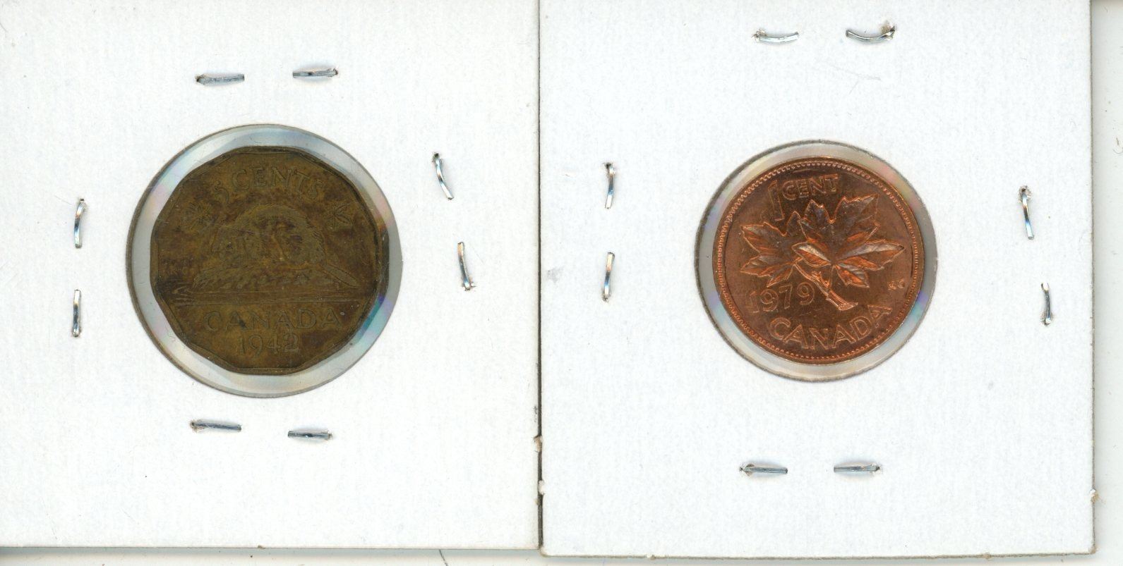1942 Canada 5 Cents VG -6 and 1979 Canada One Cent MS.
