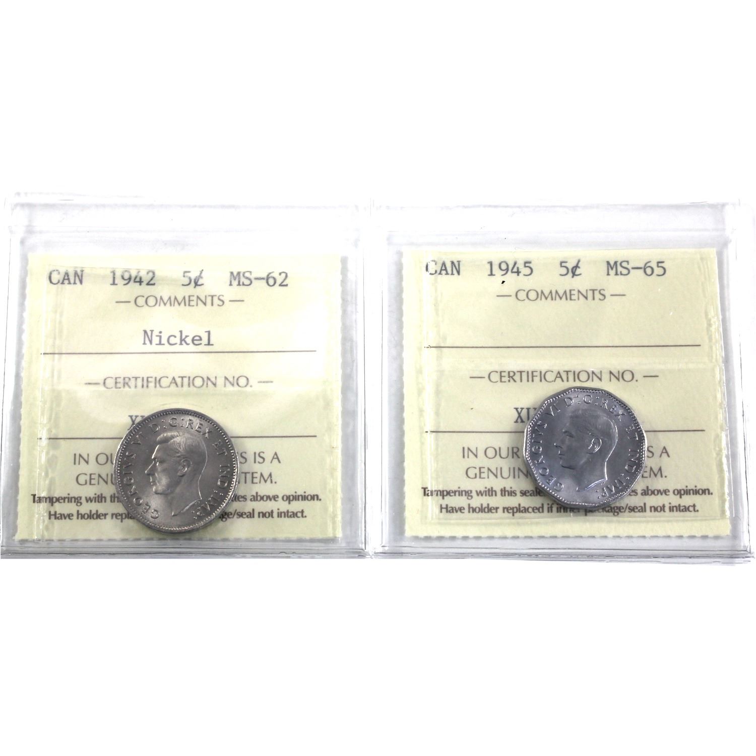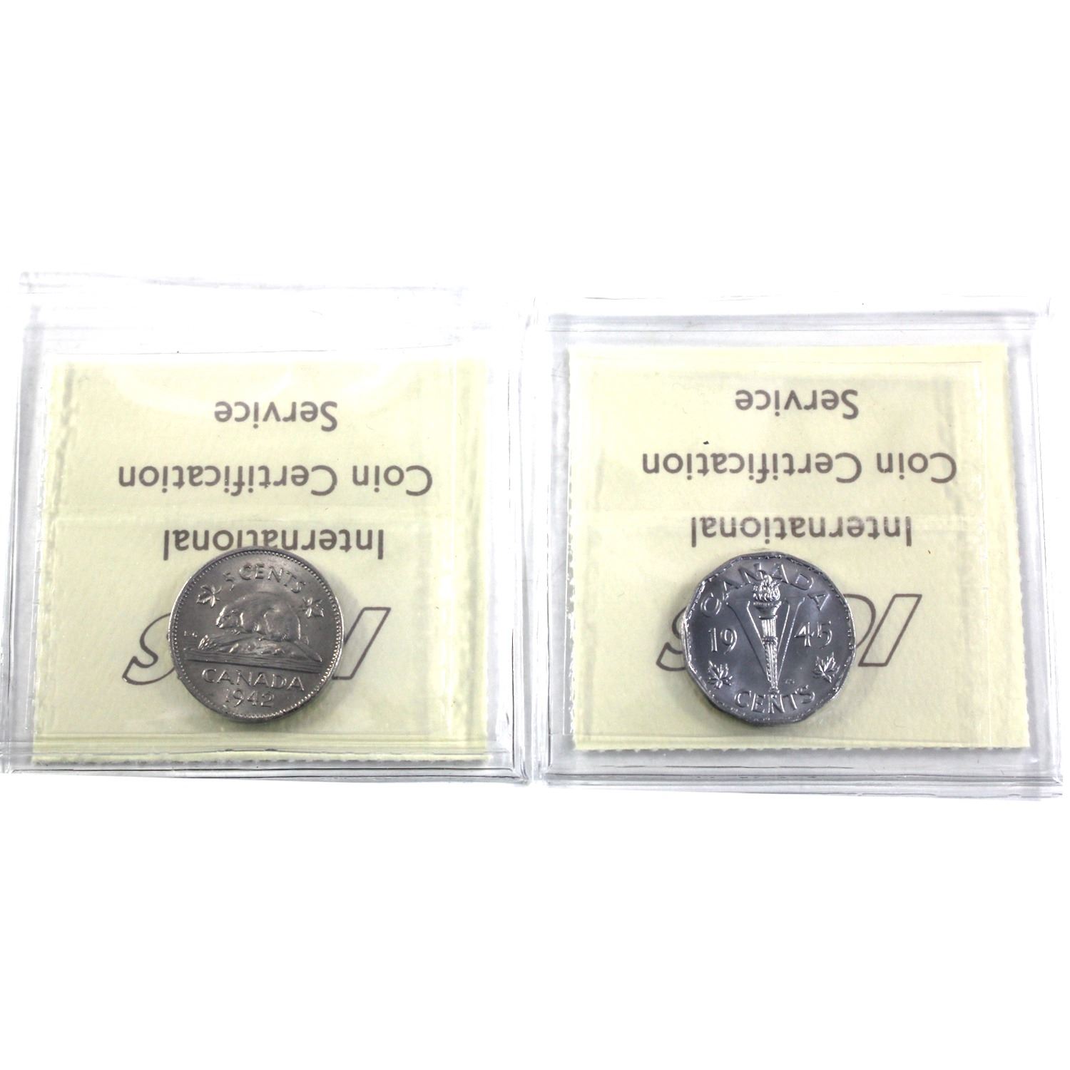1942 Canada 5c ICCS Certified MS-62 & 1945 Canada 5c ICCS Certified MS-65. 2pcs