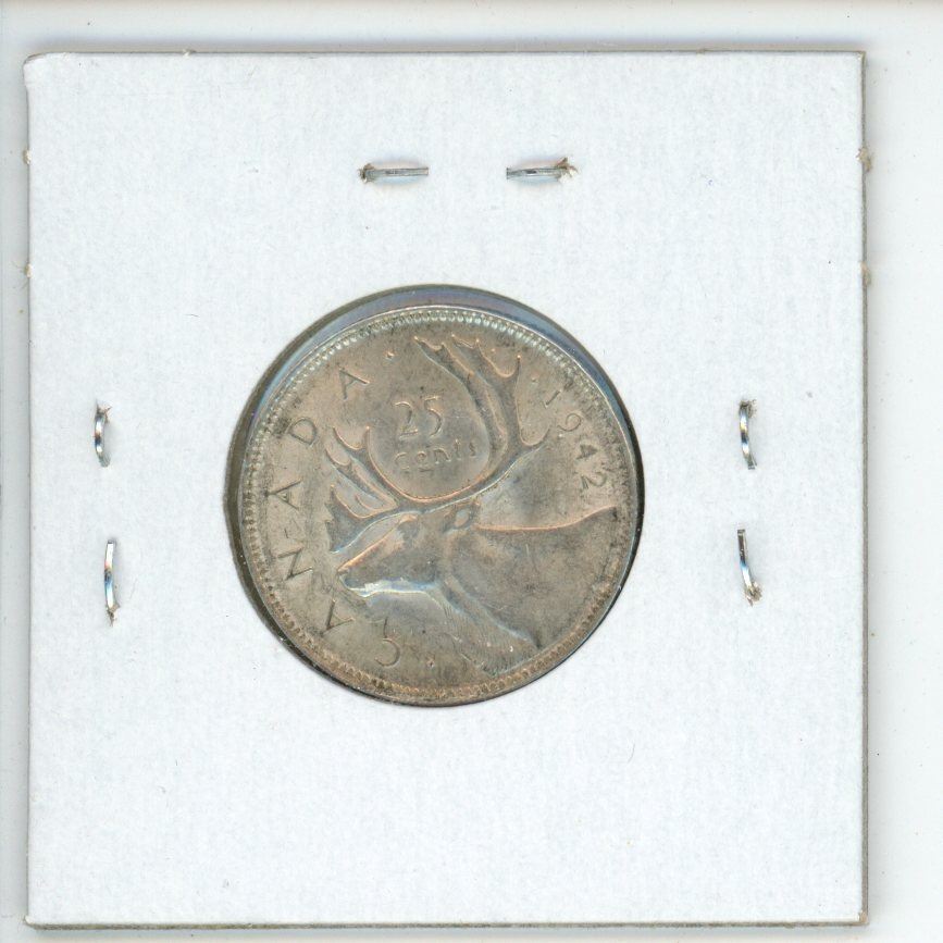 1942 Canadian Silver 25 Cents. Minted during World War II. EF-40. Nice.
