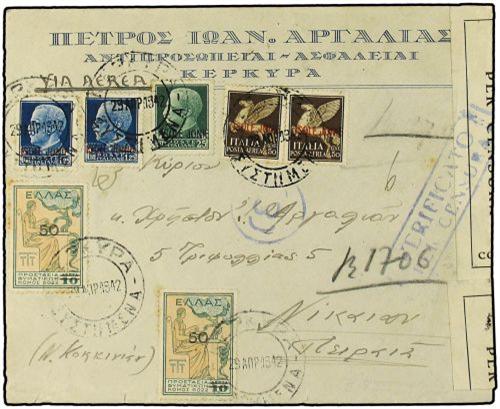 1942 Censored envelope to ATHENS bearing Greece 50 on 10 l. orange and green (2) (SG C 569) mixed with Italian occupation 25 cent. green (SG 4), 1 lira 25 blue (2) (SG 8) and 50 cent. brown (2) (SG 9) tied by CORFU double ring with boxed censor label and cachet of the Italian Occupation. Scarce item of commercial mail.