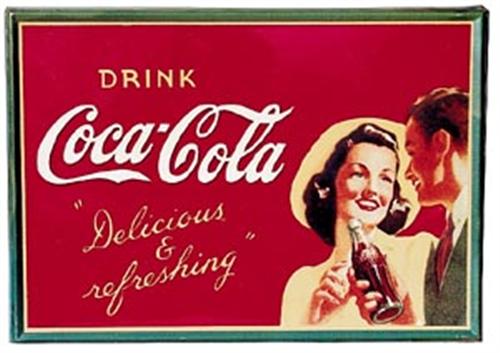 Strong graphic classic image from the 1940's featuring guy and gal with bottle. A few light surface scratches, lower right corner. Otherwise very clean within the border with only 2 shallow dented areas visible when the glare of light hits it. Otherwise, wonderfully clean and bright. A few minor paint chips and nicks on the outer green raised border. Cond. 9.0-9.3, displays even better.