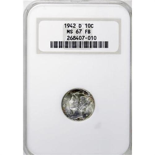 <B>1942-D 10C MS67 Full Bands NGC.</B></I> . NGC Census: (583/12). PCGS Population (413/16). Mintage: 60,740,000. Numismedia Wsl. Price for NGC/PCGS coin in MS67: $164. (#5039)<BR><BR><B>Coin Engraver:</B> Adolph A. Weinman<BR><BR><b>Shipping:</b> Coins & Currency (<a target="_blank" href="http://www.heritageauctions.com/common/shipping.php">view shipping information</a>)
