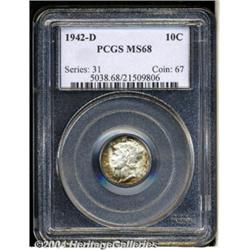 <B>1942-D<10C> MS68 PCGS.</B></I> Deep olive, russet, and red-orange toning adorns the obverse peripheries, while the centers are untoned and chalk-white. The essentially brilliant reverse shows a few traces of speckled patina near the borders, and both sides are impeccably preserved. Well struck, the central reverse crossbands appear to be fully split. <BR><BR><B>Important notice:</B> Heritage usually auctions material at the rate of 200-250 lots per hour. On some occasions eBay Live bid software or the Internet may not be able to keep up with the pace of the auction. We recommend placing a realistic absentee bid now as insurance to avoid disappointment. Occasionally the auctioneer may eliminate or reject an eBay Live bid, and the auctioneer may also reopen a lot after the close of the eBay live bidding (usually because we missed an audience bid), and may reject your bid even if it shows you as the winning bidder. By bidding via eBay Live, you agree that Heritage may award the lot to another bidder at its sole discretion under the circumstances described above or any other reasonable circumstances. Since eBay bids are not shown to us until we open the lot on the floor, we treat those bids just like floor bids. In most cases the floor responds before the eBay bid is presented to us, due to Internet lag time, so for consistency we have made it a policy that floor bids are always considered first over tie eBay live bids. Also please note that all Heritage lots purchased through eBay Live carry a 20% Buyer's Premium. Please make sure you read the Terms and Conditions before you bid. </span></font></tr></table></td></tr></table>