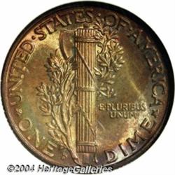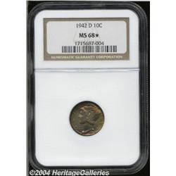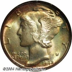 <B>1942-D<10C> MS68 <S NGC.</B></I> Medium intensity multicolored toning visits both sides of this exquisitely struck D-mint issue. The surfaces are impeccably preserved, revealing no mentionable impairments. A truly beautiful Star designation coin. Population: 1 in 68, 0 finer with a star designation (6/04). <BR><BR><B>Important notice:</B> Heritage usually auctions material at the rate of 200-250 lots per hour. On some occasions eBay Live bid software or the Internet may not be able to keep up with the pace of the auction. We recommend placing a realistic absentee bid now as insurance to avoid disappointment. Occasionally the auctioneer may eliminate or reject an eBay Live bid, and the auctioneer may also reopen a lot after the close of the eBay live bidding (usually because we missed an audience bid), and may reject your bid even if it shows you as the winning bidder. By bidding via eBay Live, you agree that Heritage may award the lot to another bidder at its sole discretion under the circumstances described above or any other reasonable circumstances. Since eBay bids are not shown to us until we open the lot on the floor, we treat those bids just like floor bids. In most cases the floor responds before the eBay bid is presented to us, due to Internet lag time, so for consistency we have made it a policy that floor bids are always considered first over tie eBay live bids. Also please note that all Heritage lots purchased through eBay Live carry a 20% Buyer's Premium. Please make sure you read the Terms and Conditions before you bid. </span></font></tr></table></td></tr></table>