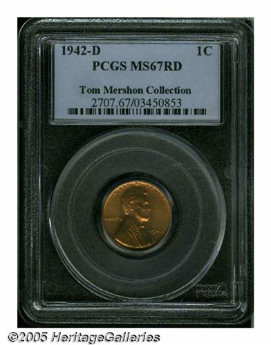 <B>1942-D<1C> MS67 Red PCGS.</B></I> Pleasing light color and bright satiny luster represent the better aspects of this carefully preserved example, which is also quite well struck. A tiny, barely discernible scratch, to the right of Lincoln's ear, is mentioned for the sake of accuracy, but does not have sufficient size to distract the unaided eye. Population: 198 in 67, 1 finer (3/05).<BR><I>From The Tom Mershon #2 All-Time PCGS Registry Set of Lincoln Wheat Cents.</B></I>