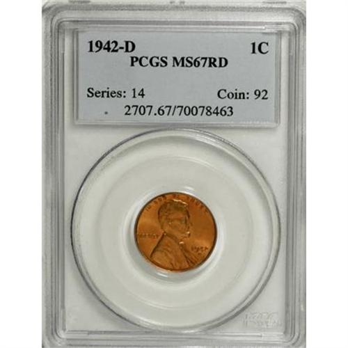 <B>1942-D 1C MS67 Red PCGS.</B></I> PCGS Population (235/2). NGC Census: (729/0). Mintage: 206,698,000. Numismedia Wsl. Price for NGC/PCGS coin in MS67: $100. (#2707)<BR><BR><B>Coin Engraver:</B> Victor D. Brenner<BR><BR><b>Shipping:</b> Coins & Currency (<a target="_blank" href="http://www.heritageauctions.com/common/shipping.php">view shipping information</a>)