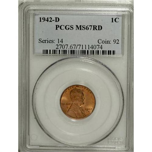 <B>1942-D 1C MS67 Red PCGS.</B></I> PCGS Population (235/2). NGC Census: (730/0). Mintage: 206,698,000. Numismedia Wsl. Price for NGC/PCGS coin in MS67: $100. (#2707)<BR><BR><B>Coin Engraver:</B> Victor D. Brenner<BR><BR><b>Shipping:</b> Coins & Currency (<a target="_blank" href="http://www.heritageauctions.com/common/shipping.php">view shipping information</a>)