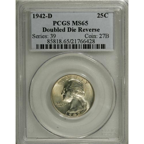 <B>1942-D 25C Doubled Die Reverse MS65 PCGS.</B></I> FS-016; Breen-4316. Doubling is strongest on the eagle's beak, the lower wreath, and the bottom of the arrow shafts. PCGS has to date certified only 11 pieces of this rare variety in all grades. The Gem in this lot displays dazzling luster and a light veneer of tan-gold color, along with sharply impressed design elements. A few minute obverse marks prevent an even higher grade.<BR><BR><b>Shipping:</b> Coins & Currency (<a target="_blank" href="http://www.heritageauctions.com/common/shipping.php">view shipping information</a>)