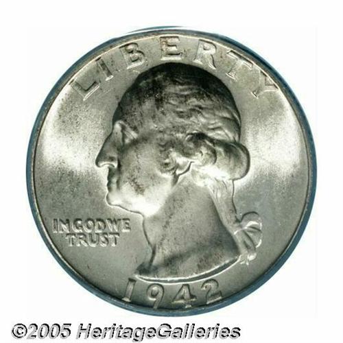 <B>1942-D<25C> Doubled Die Reverse MS66 PCGS.</B></I> FS-016; Breen-4316. The most visible attribute of this variety is strong doubling on the wreath below the eagle. The only previous record of this variety that we can find being sold is an MS64 coin in the Suros Collection sale of 1999. This example is quite sharply struck and is essentially a brilliant Gem with only faint traces of champagne and iridescent toning. Population: 1 in 66, 0 finer (3/05).