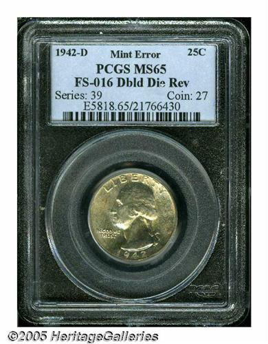 <B>1942-D<25C> MS65 PCGS.</B></I> Doubled Die Reverse FS-016. Even golden reverse with mottled sea-foam and violet additions on the obverse. A well preserved Gem example with no serious imperfections.