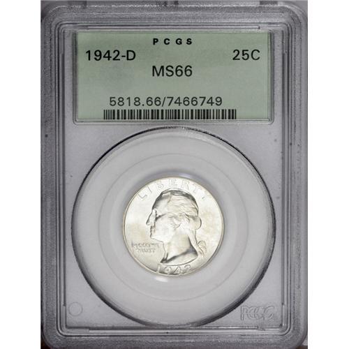 <B>1942-D<25C> MS66 PCGS.</B></I> A light golden-brown and sky-blue older holder Premium Gem with impressive preservation and the usual slight softness on the legends close to the rims.