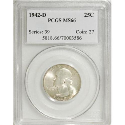 <B>1942-D 25C MS66 PCGS.</B></I> . PCGS Population (365/29). NGC Census: (382/143). Mintage: 17,487,200. Numismedia Wsl. Price for NGC/PCGS coin in MS66: $120. (#5818)<BR><BR><B>Coin Engraver:</B> John Flanagan<BR><BR><b>Shipping:</b> Coins & Currency (<a target="_blank" href="http://www.heritageauctions.com/common/shipping.php">view shipping information</a>)