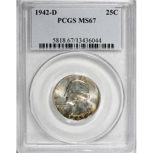 <B>1942-D 25C MS67 PCGS.</B></I> Silver-white surfaces predominate overall, though the obverse margins show peach and lemon-gold toning. Solidly struck and a great Superb Gem. Population: 29 in 67, 0 finer (2/08).<BR><BR><B>Coin Engraver:</B> John Flanagan<BR><BR><b>Shipping:</b> Coins & Currency (<a target="_blank" href="http://www.heritageauctions.com/common/shipping.php">view shipping information</a>)